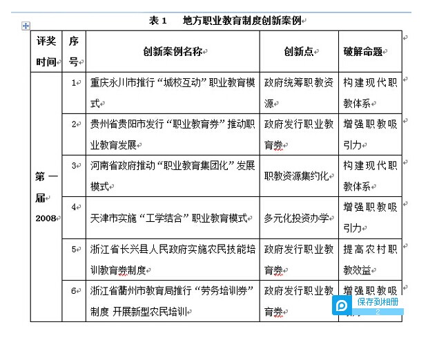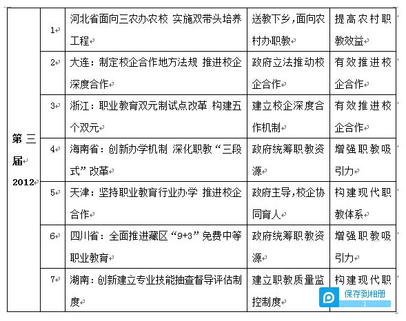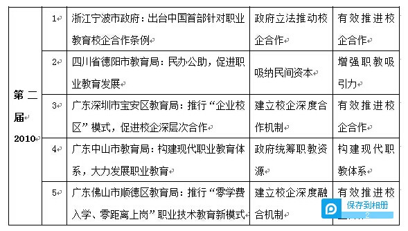 从2008年开始,“地方职业教育制度创新奖”评选已有三届,经过6年时间的发展,我们明显看到,一些地方政府坚持职业教育制度创新所取得的突出成绩。比如,浙江省教育厅、劳动与社会保障厅于2008年联合发文进行“职业教育‘双元制’试点改革”,成功构建了“五个双元”:双元招生,双元计划,双元师资,双元管理与评价,双证书,经过5年实践,开辟了“校企合作”新模式,在实践中取得了突出成效。