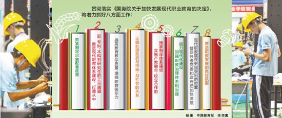 教育部副部长鲁昕指出,6月22日发布的《国务院关于加快发展现代职业教育的决定》(以下简称《决定》),“创新了职业教育的理念”。她举了一个例子,以前职业教育强调“技能型人才”,而这次把“技能”前面加了一个“技术”,“为什么?就是适应技术进步、生产方式变革以及社会公共服务需要。”