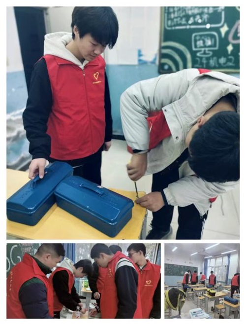 机电技术部了解到各班有一些桌椅不同程度出现了破损情况,针对这些问题,志愿者们决心要变废为宝,修理好这些“生病”的学习用具。他们准备修理工具和小零件开始行动,“小医生”各个分工明确、配合默契:有的仔细排查桌凳松动、摇晃、螺丝缺失等问题,有的手持扳手、螺丝刀紧固螺丝,有的用砂纸打磨破损边缘,有的更换损坏的桌腿、凳面……面对不同类型的故障,同学们逐一修复。原本摇晃不稳的课桌、无法正常使用的座椅,经过志愿者们的巧手,很快恢复了“健康”,重新变得牢固实用。