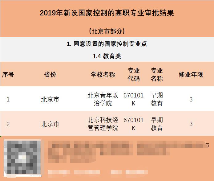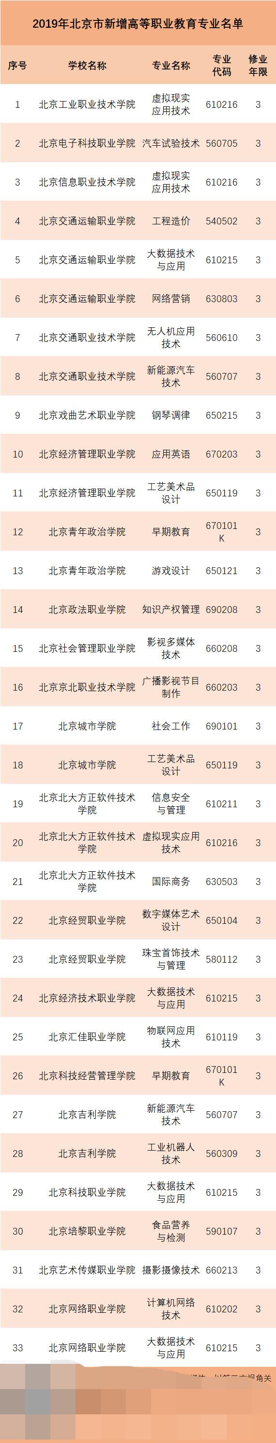 另外,根据教育部公布的备案审批结果,2019年北京市新增高等职业教育专业名单涉及33个专业,修业年限均为3年。其中包括虚拟现实应用技术、工程造价、无人机应用技术和早期教育等。酿酒技术、机械产品检测检验技术、机械设计与制造等与与首都城市功能定位不符的专业则退出今年招生。