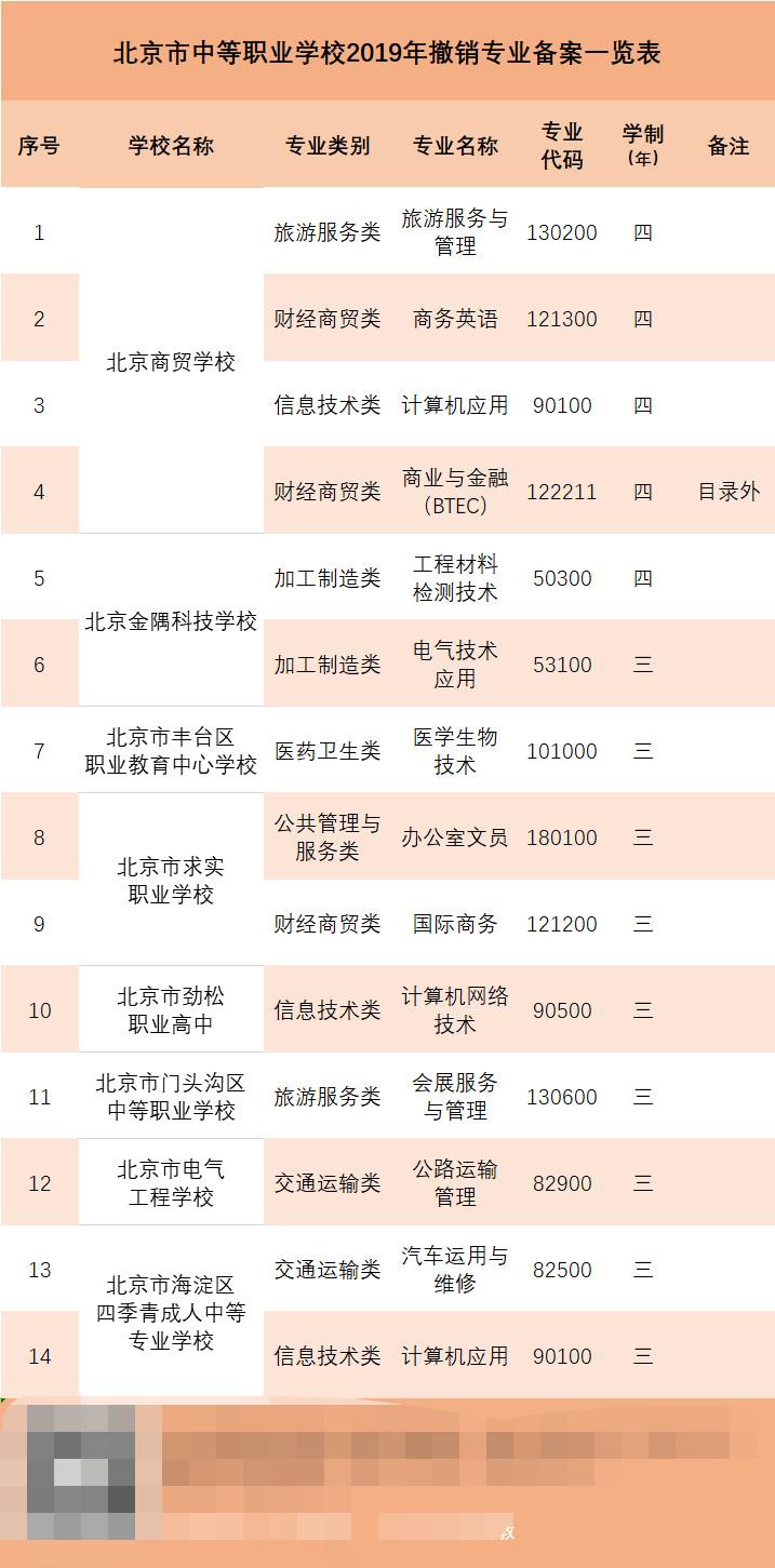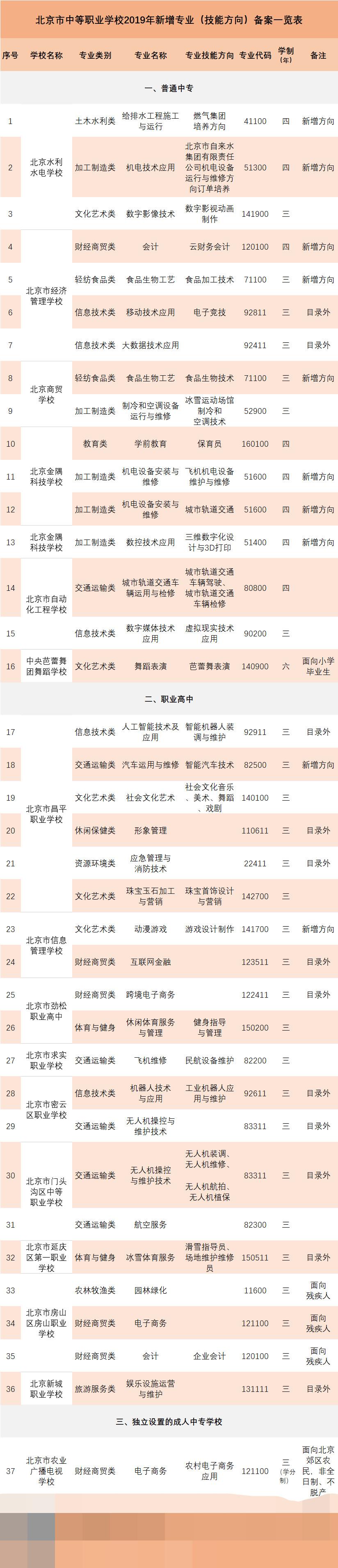 北京市教委组织专家对部分中等职业学校申报的2019年新增专业(技能方向)进行了综合评议,研究确定对16所学校37个新增专业(技能方向)进行备案,从2019年起列入招生计划,同时撤消8所学校14个专业。
