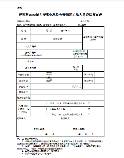 迁西县乡街事业单位公开招聘工作领导小组办公室关于开展考生资格复审工作的通知根据《迁西县2020年乡街事业单位公开招聘工作人员公告》,定于2020年12月1日对进入资格复审程序的考生开展资格复审工作,现将有关事宜通知如下: 一、审核地点 迁西县人力资源和社会保障局主楼二楼东侧大会议室。 二、时间安排 12月1日上午8:30—12:00报考岗位1、岗位2、岗位3、岗位4、岗位5、岗位6、岗位7、岗位8、岗位9、岗位10、岗位11、岗位12、岗位14、岗位15、岗位16、岗位17、岗位18的考生资格复审。 12月1日下午13:30-17:30报考岗位19、岗位20、岗位21、岗位22、岗位23、岗位24、岗位25、岗位26、岗位27、岗位28、岗位29、岗位30、岗位31、岗位32、岗位33、岗位34、岗位35、岗位36的考生资格复审。 12月2日资格复审情况梳理汇总,处理有关具体问题。 三、提供材料 进入资格复审程序的考生需本人携带笔试准考证,亲往证件审核地点,同时按岗位信息表要求,认真填写《迁西县2020年乡街事业单位公开招聘工作人员资格复审表》(附件1),并提供以下涉及的相关材料。 (一)户籍、年龄信息:提供本人身份证、户口本(主页及本人页),以配偶户籍报考考生需提供配偶户口本(主页及配偶本人页)、结婚证,以生源地报考考生需提供户口迁出户口页原件及复印件。 (二)学历、学位、专业信息:提供毕业证、学位证原件及复印件,属“高校毕业生”的,因疫情原因未能如期拿到毕业证和学位证的,需出具本专科或研究生阶段成绩单原件及复印件、《2020年普通高校毕业生就业协议书》。 (三)限“高校毕业生”报考的,需提供本人离校时其户口、档案、组织关系仍保留在原毕业学校,或保留在各级毕业生就业主管部门、毕业生就业指导服务中心、各级人才交流服务机构和各级公共就业服务机构出具的相关证明(证明需加盖单位行政公章,出具人亲笔签字,留固定电话)。 (四)定向招聘:岗位6、岗位25限大学生退役士兵报考的,需提供本人身份证、毕业证、报到证、退伍证原件及复印件;岗位30限“三支一扶”支农和扶贫计划人员的,需提供相关服务项目合同(协议)、服务期满合格证原件及复印件。 (五)留学回国人员和其他海外、外国学历获得者需提供国家学历认证等相关证件材料原件及复印件。 (六)其他按照招聘岗位条件要求能够证明考生符合报考岗位条件要求的相关证件材料原件及复印件。 四、有关要求 请各考生按公告、岗位信息表及本通知要求备齐相关审核资料,严格按时间节点参加资格复审,考生资格复审时间最迟为2020年12月1日17:30,因特殊情况不能参加的要及时与迁西县人力资源和社会保障局联系,无正当理由逾期未参加审核的视为自动放弃面试资格。参加资格复审的考生需全程佩戴口罩。 联系电话:0315-5685156 附件:1、迁西县2020年乡街事业单位公开招聘工作人员资格复审表