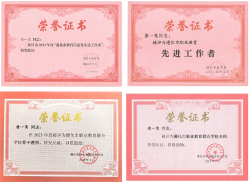 教师是知识的传播者,更是学生探索未来的引路人。作为信息技术教师,唐一鸾老师以培养有创新思维与技术素养的学子为己任,课堂上化枯燥代码为生动项目,融复杂操作于趣味案例,唤醒学生对信息技术的热爱;课后深耕课程建设,探索教学改革与技术融合新路径,让课堂兼具技术深度与应用温度。凭借对教学的深耕与对职教的热忱,先后荣获遵化市教育信息化先进工作者、遵化市职业教育先进工作者称号,并被评为校级骨干教师、校级名师,每份荣誉都见证着扎根一线的坚守,彰显用技术赋能教育、用匠心培育人才的担当。
