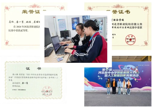 在近年职业技能大赛中,作为指导教师,她充分激发学生探索数字领域的热情,在训练中研算法、练实操,精准把控竞赛每处细节。“千淘万漉虽辛苦,吹尽狂沙始到金”,历经打磨,最终指导学生在2025年河北省职业技能大赛中获得二等奖、在2025年河北省学生信息素养提升实践活动中获得二等奖。此外,她还不断提升自己,在2024年河北省职业院校技能大赛教学能力比赛中荣获二等奖。