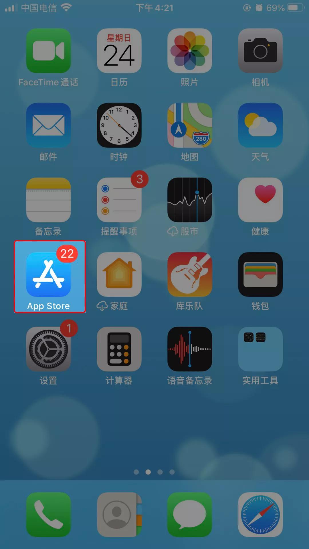 首先在手机找到App Store(苹果手机唯一的软件下载商店)